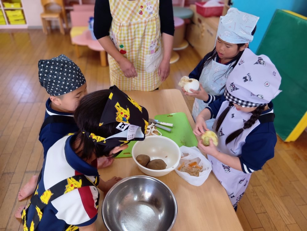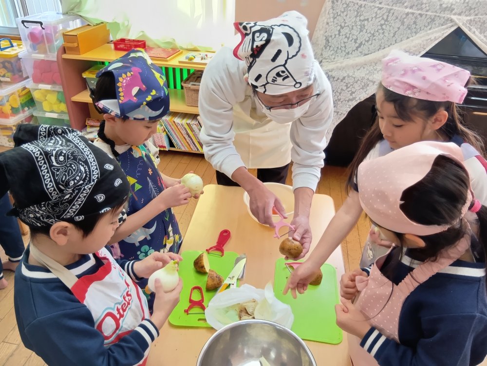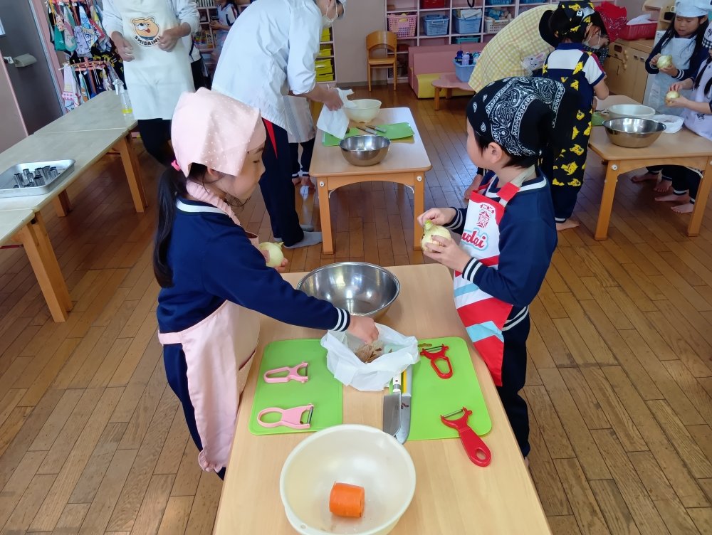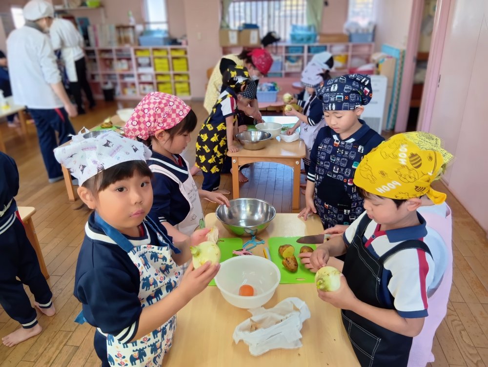 給食の先生に教えてもらいながらカレーライスを作りました😊