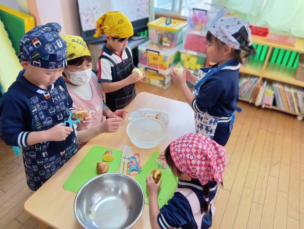 給食の先生に教えてもらいながら野菜の皮をむいたり切ったりしました!(^^)!